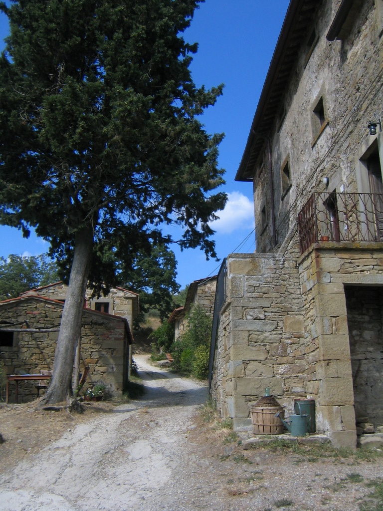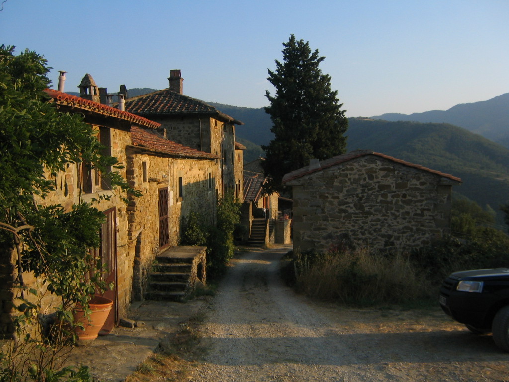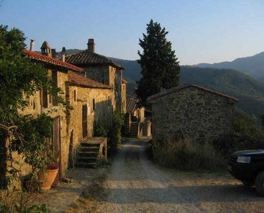 Fig. No. 2. A view of the borgo from the “end of town” looking south. On the left are Valeria’s house, the chapel, the casa padronale, and our house. You can’t quite see Alda and Claudio’s house in this photo. On the right is the Schlichtings’ storage building. That’s Bob and Denny’s Range Rover in the foreground.