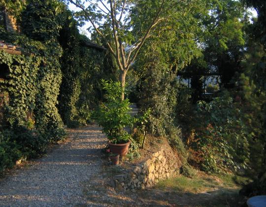 Fig. No. 1. The gravel path to Alda and Claudio’s ivy-covered house. The grassy path that slopes down to the right leads to Claudio’s vineyard and vegetable garden. You can just make out their covered terrace on the right to the rear.