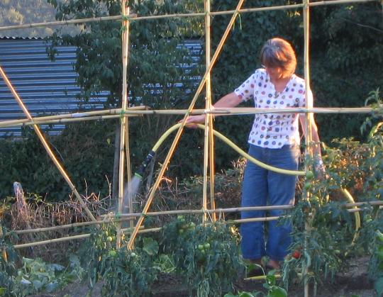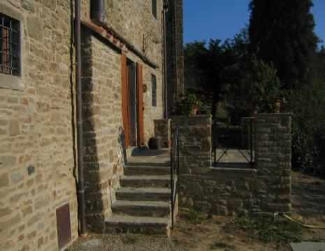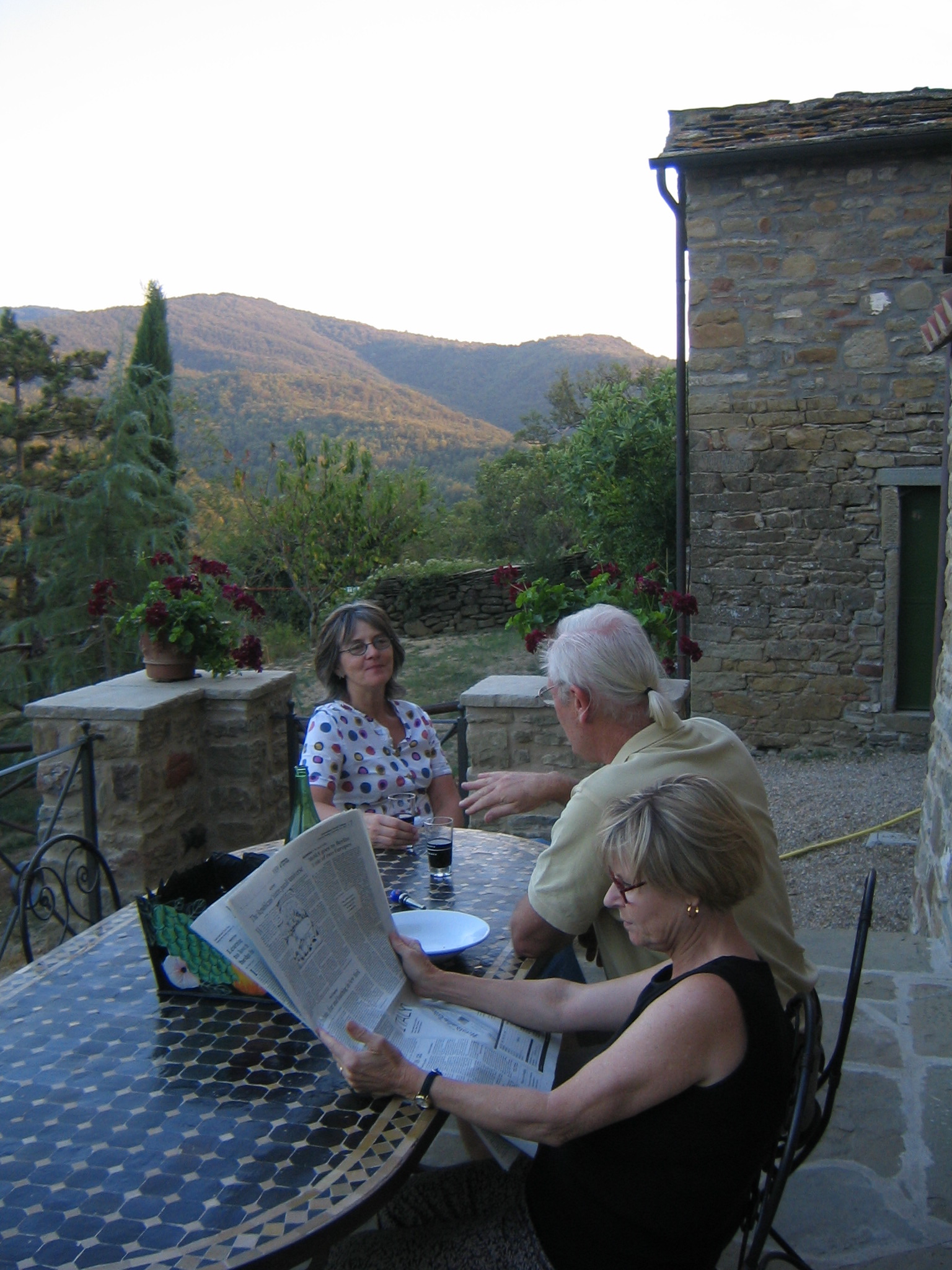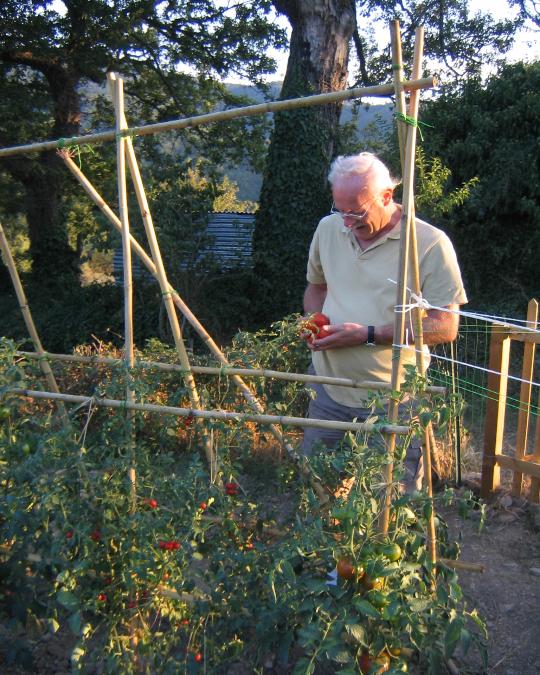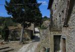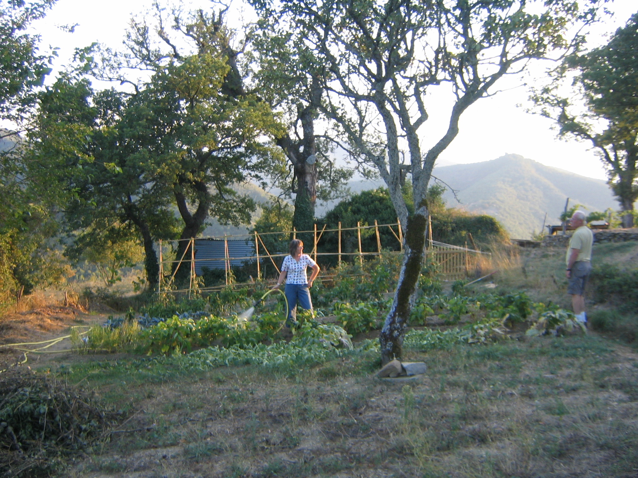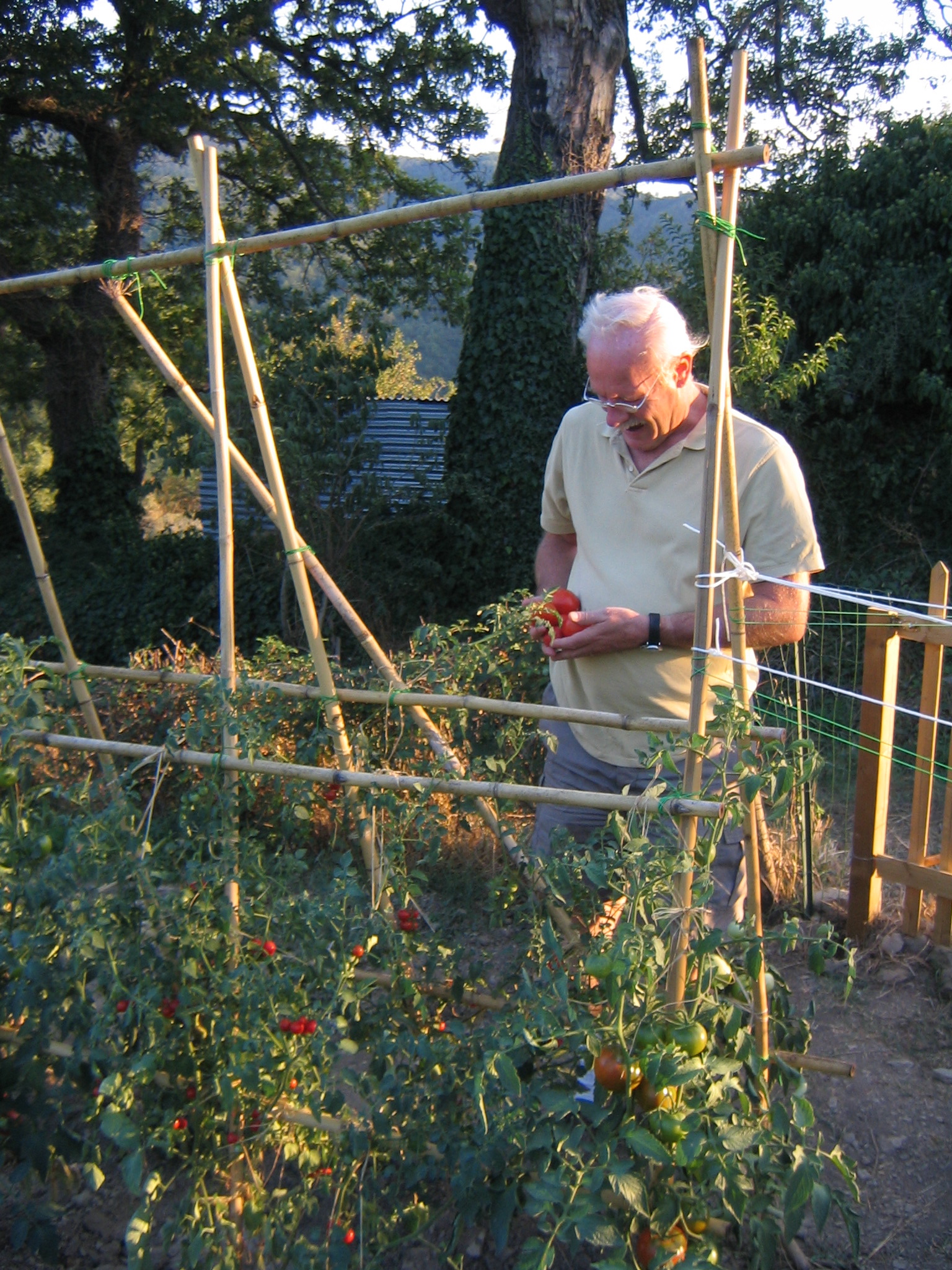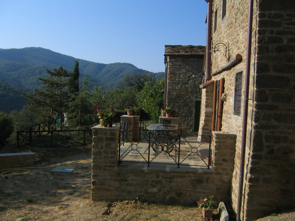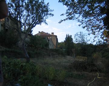 Fig. No. 3: The view of our house from our vegetable garden (orto). The tree in the foreground is an ancient pear. It still produces pears. In the area beyond the pear we're putting in a small orchard of fruit trees, about 12 total.